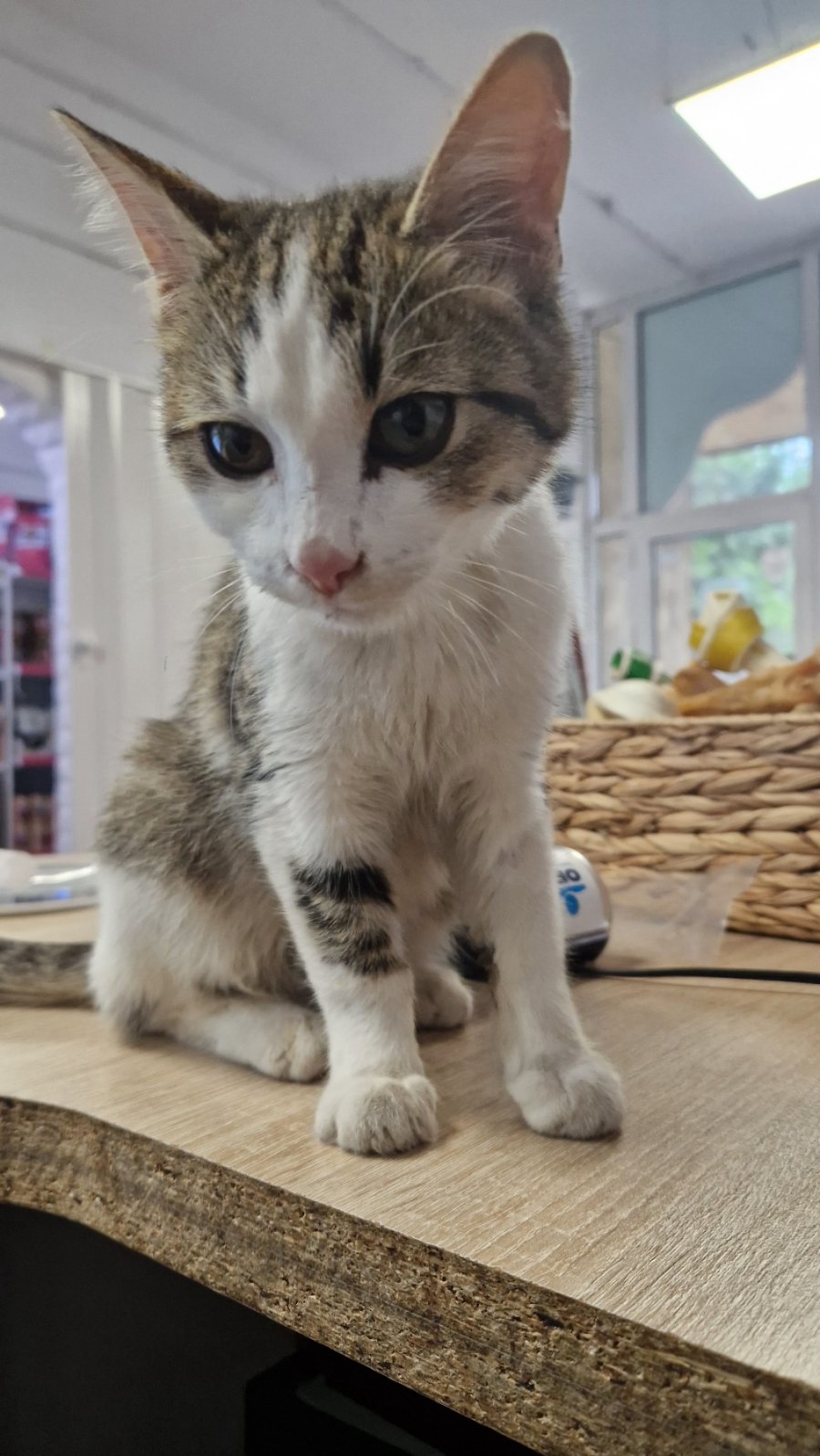 Преди няколко дни съдбата ме срещна с това прекрасно мъниче — момченце на около 4-5 месеца според ветеринарите, което щеше да бъде блъснато на оживен булевард. Не можах да го оставя в опасност и го прибрах в работата си временно, докато му намеря сигурен дом.