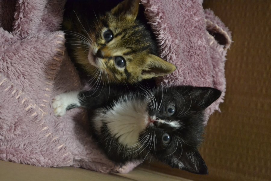 Спасени от строеж, на около 5-6 седмици. Тигър е момиче, черно е момче. Третирано срещу бълхи и паразити.