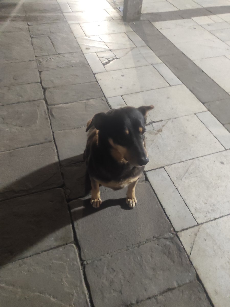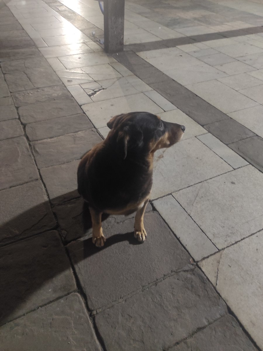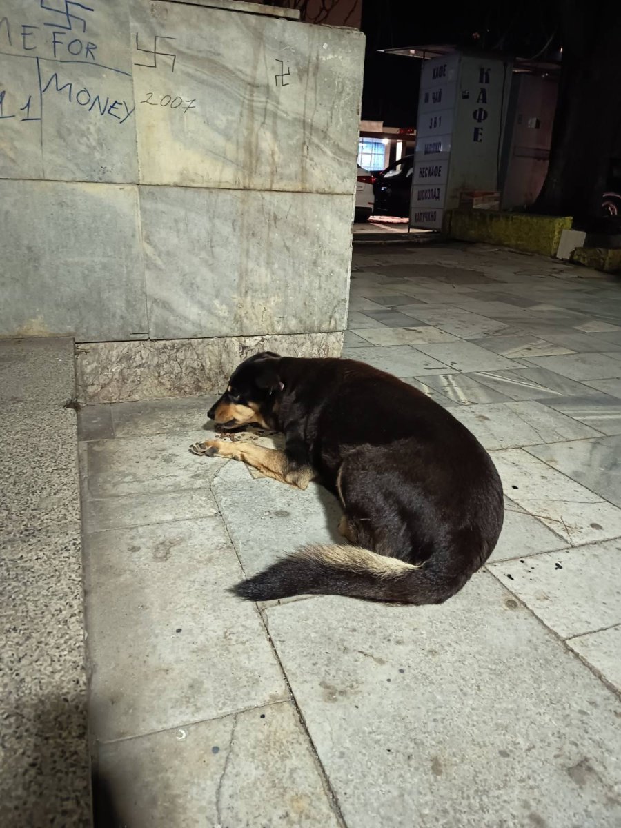 Това е Бубка, която живее на жп гарата в Мездра. Тя лежи на плочките на перона, няма дори постлан картон, няма купичка с вода и е хранена инцидентно от милостта на случайни пътници и местен, който храни кучетата в центъра, когато има и може. Винаги е много гладна. Характерно за не я е, че се храни легнала. Спи в гнездо от сухи листа в края на перона до едни бараки и съжителства със семейство котки и други приходящи кучета.