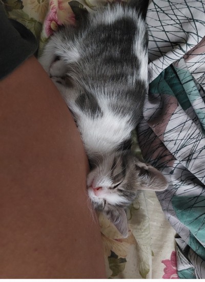 Намерена изхвърлена. Има вече изградени хигиенни навици. Обезпаразитена вътрешно и външно. Игрива и гушкава. Търси постоянен дом, в който ще е обичана. На около 2 месеца. Сиво-бяло със сини очи.