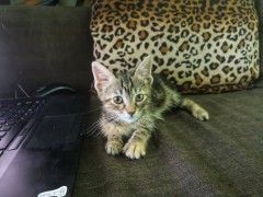 Малката глезанка намерихме сгушена в една дупка, докато се разхождахме с кучето, с голям кърлеж и корона вирус. След дълга карантина, котанка е излекувана, обезпаразитена, с отлични хигиенни навици, на около 2,5 месеца. Най-много обича да хапва и да се гушка в любим човек. Много е смела и се разбира с други котки и кучета.