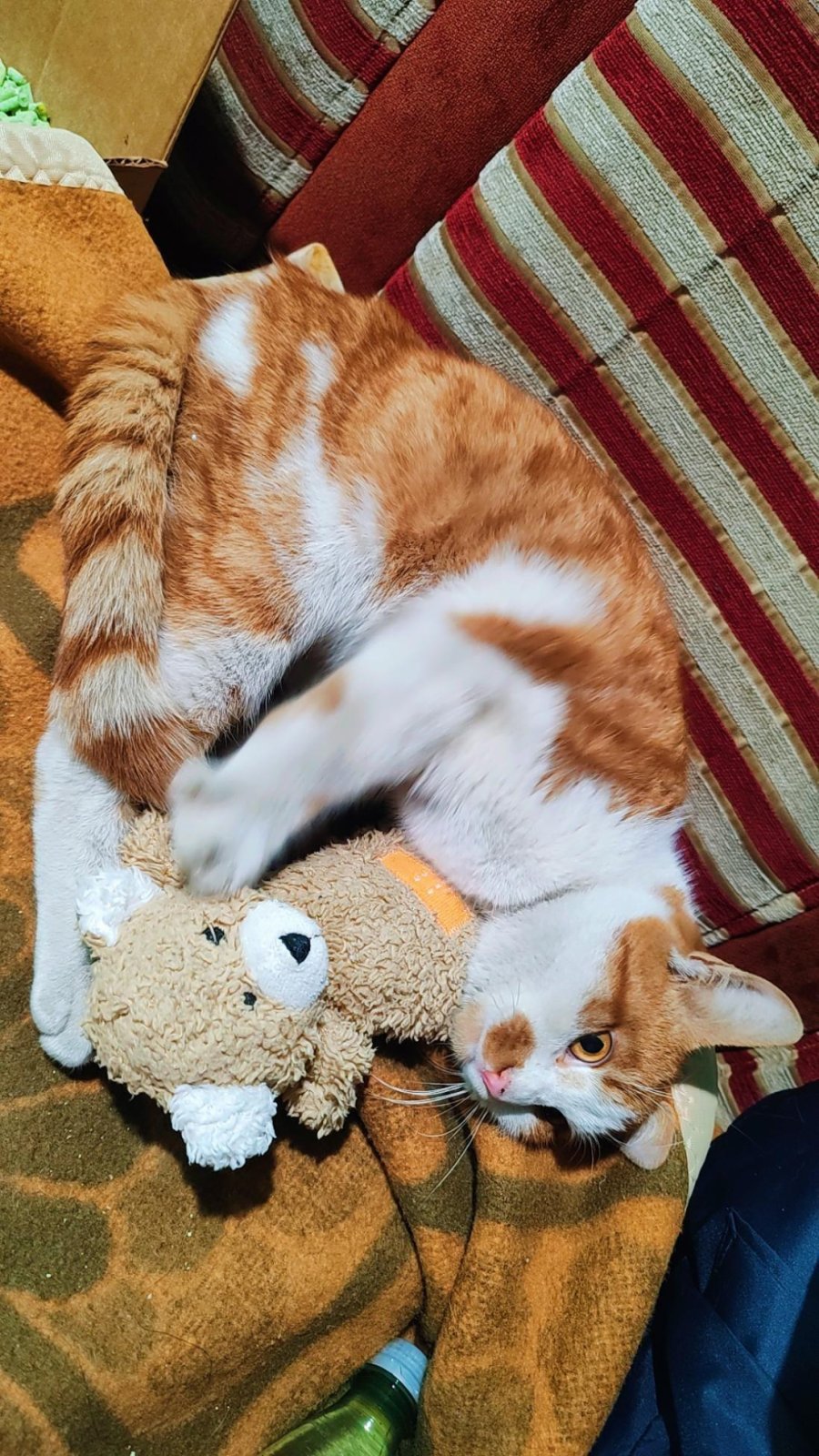 Мъжко котараче на 4-5 месеца, намерено вчера в изоставена маза, заведено на ветеринар, здраво, похапва доста, със стара травма на таза, но не се плашете ходи сам по голяма и малка нужда, ходи и дори си тича, походката му може и да е леко смешна, но това не го спира да е най-доброто момче, обича да се гушка,да мърка, да го галят и да дава мнооого любов. Има си мече което гушка,когато спинка и ми се струва недопустимо да ги разделим ????